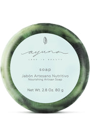 AYUNA soap is obtained from Borage, Olive and Coconut oil, this artisanal bar provides an extra soft, creamy cleanse that is ideal for all skin types. The AYUNA soap formula is enriched with botanical Activated Carbon to provide the skin with a deep detox: it absorbs (attracts and clings to) impurities, excess sebum and toxins. The skin feels soft, clean, and revitalized and looks radiant.