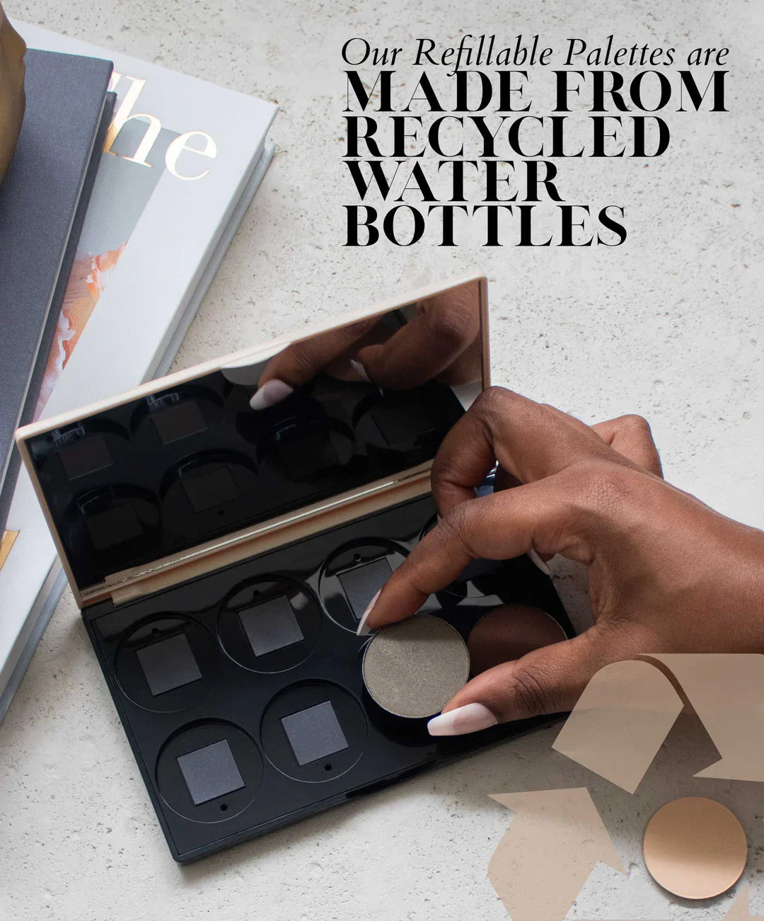 Turning trash into beauty with a 4-shade refillable pressed shadow compact made from 100% recycled plastic. Easy-to-wear skincare-enriched shades in an easy-to-refill palette.